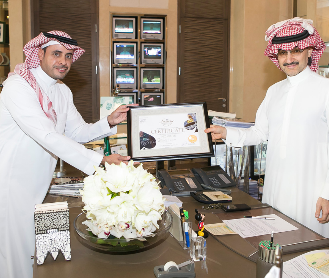 HRH Prince Alwaleed Bin Talal congratulating Mr. Abdulrahman Al Khathlan on Luxury Lifestyle Award Certificate. Mr. Abdulrahman Al Khathlan was awarded the prestigious Luxury Lifestyle Award on behalf of SPAZIO. The event which was held in Dubai hosted the top icons of luxury in the Middle East and was attended by 250 honorary guests including the members of Royal Families of Abu Dhabi, Dubai and Qatar.